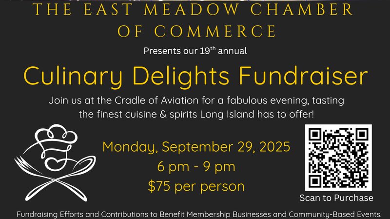 We are proud to support the 19th Annual Culinary Delights Fundraiser, hosted by the East Meadow Chamber of Commerce Foundation. This cherished event returns on September 29, 2025, at The Cradle of Aviation in Garden City, NY. From 6–9 pm, guests will enjoy an evening filled with flavors, music, and community spirit.
